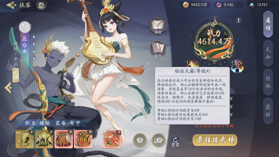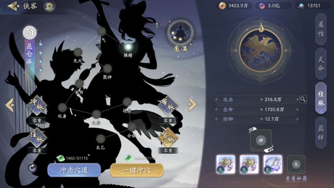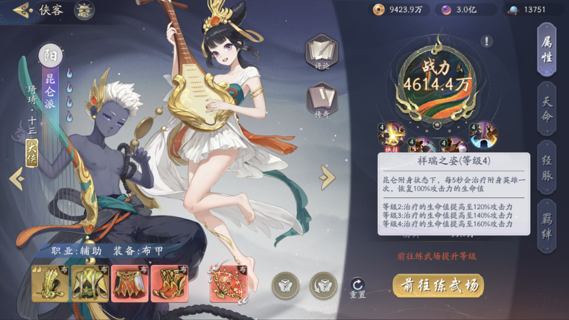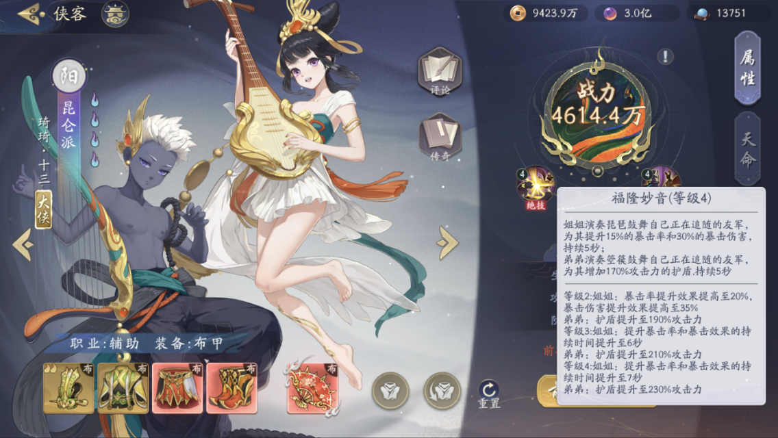 2.技能云台仙册:分别给一个前排防最高的附加30减伤和昆仑血量的30%叠加给附体的侠客,另一个是给后排攻击力最高的附加昆仑自身攻击的50%