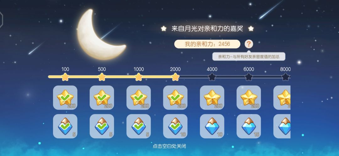 亲和力达到一定程度时,可以在旁边的月亮领取亲和力和星钻