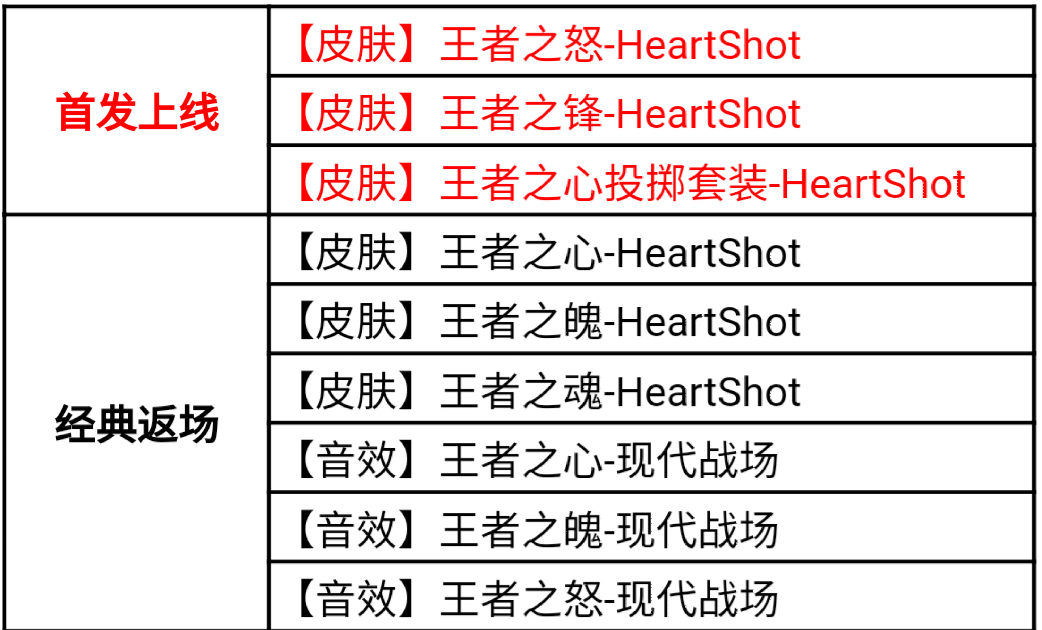 哦对了,其中王者之怒-HeartShot、王者之锋-HeartShot,以及王者之心投掷套装的HeartShot都是首次发售,这些高品质“拉丝”皮肤具有全新特效外观、专属击杀图标、 炫酷消灭特效等诸多特权,后续我们会为大家详细展示。
