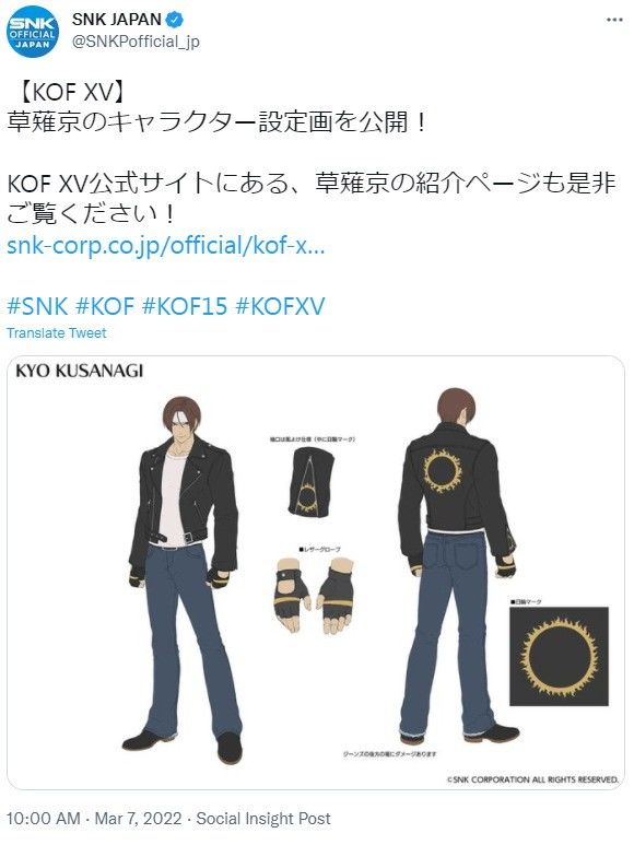 》已正式发售,备受玩家好评,今日(3月7日)SNK官方在推特上公布了《拳皇15》草薙京角色设定图,一起来看看吧!