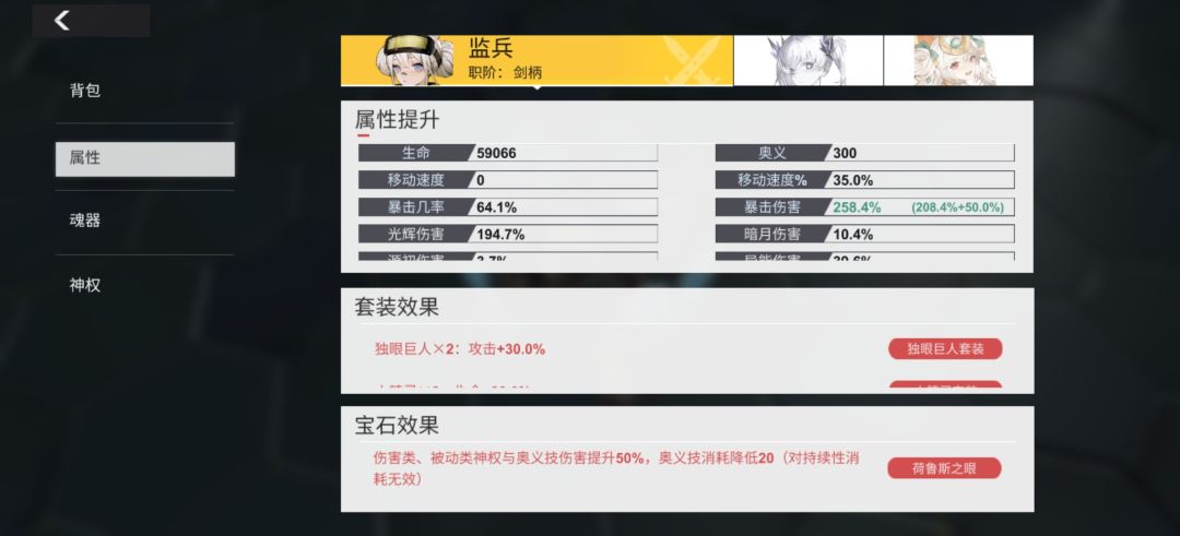 这个号白虎蚀伤是零,带的是四星希望之光宝石姬,由于兽主属性拉胯,所以用天赋加了50暴击伤害,这样才凑满60/250属性(因为另外几次测试用的兽主都是差不多这个等级的属性)