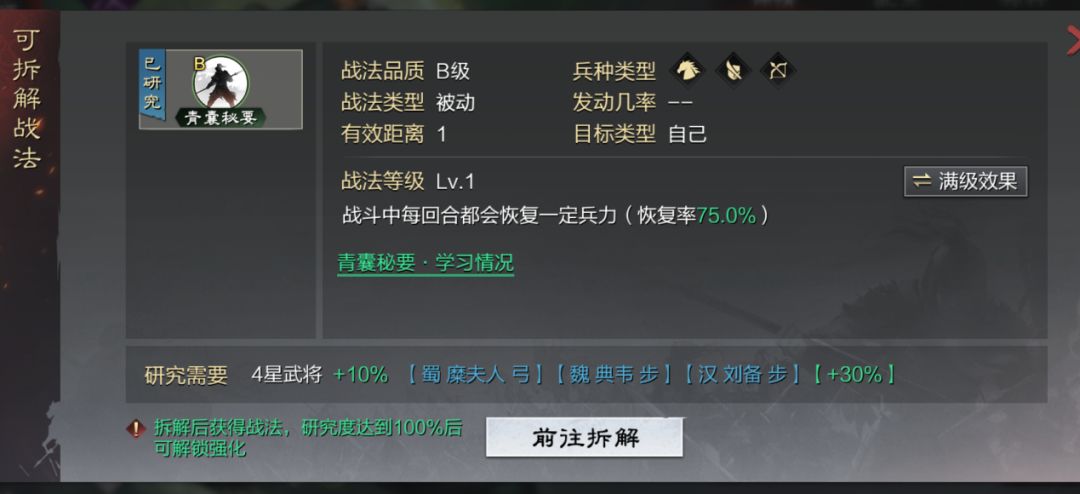 2.战法选择 每个三星及以上武将都能拆解战法,虽然是即拆即用,需要花费武将卡研究后,才能用招募武将时给予玩家的战法经验升级,发挥出真正的威力。