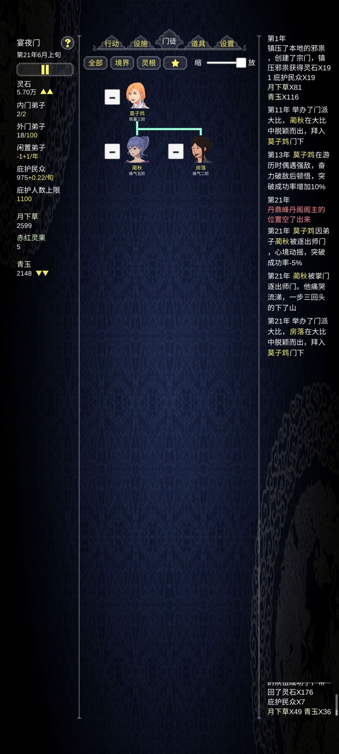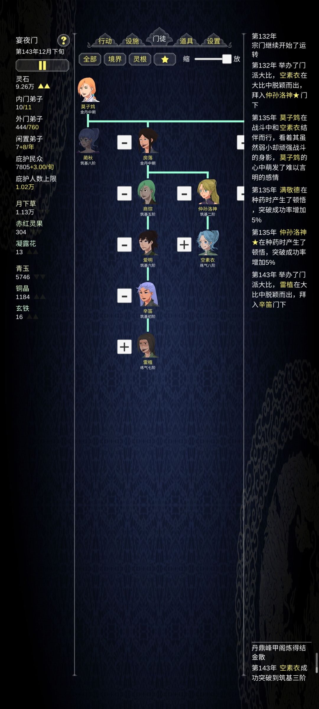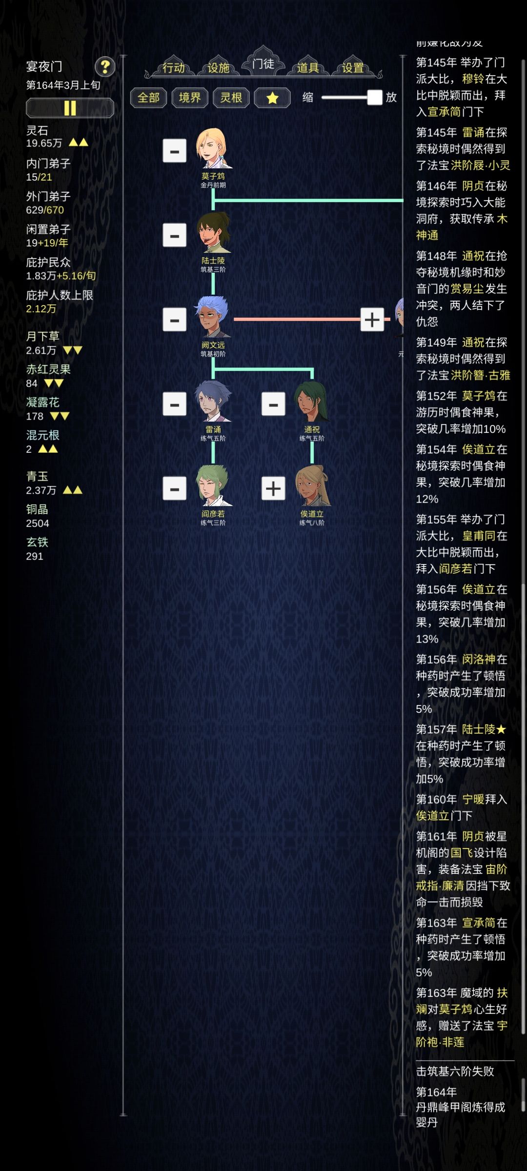 然后就是宗门不断壮大,截图给朋友看,朋友说“你二徒弟这一脉怎么都看着不像好人啊.jpg”我当时确实很担心会不会有什么徒弟修为超过师父就要开始欺师灭祖的事件,加上房落是双灵根修炼比我快没几年就追上了,我就开始压他修为(比如故意不供给他丹药看他突破失败啥的)