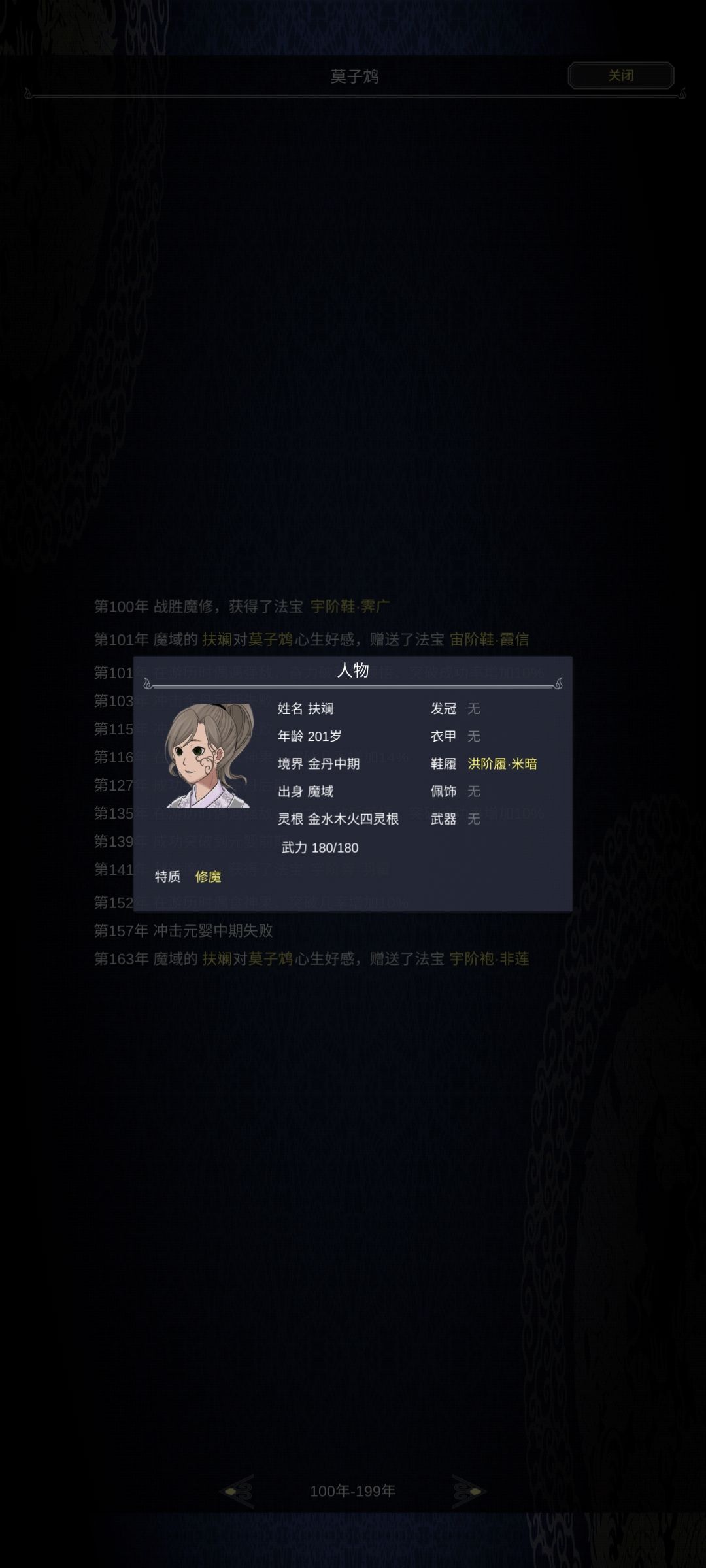 我认真玩第一把玩招了第一个徒弟,是个妹子,名叫蔺秋,杂灵根,修炼特别慢,当时我也不知道杂灵根有个可以去伏魔峰探险突变,又急于收徒,于是我在第二次大比的时候,把她逐出师门,她一步一回头的走了,当时我还不知道这句话有什么区别,(直到后来我逐其他人出师门的时候个个都用怨恨的眼神看我)然后招了二徒弟房落。