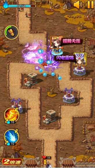 在游戏的闯关地图中,有各类不同的防御塔。目前游戏中的武将职业有弓手、炮手、法师和军师4类,他们分别对应的防御塔为弓箭塔、寒冰塔、唤雷塔、抛石塔。
