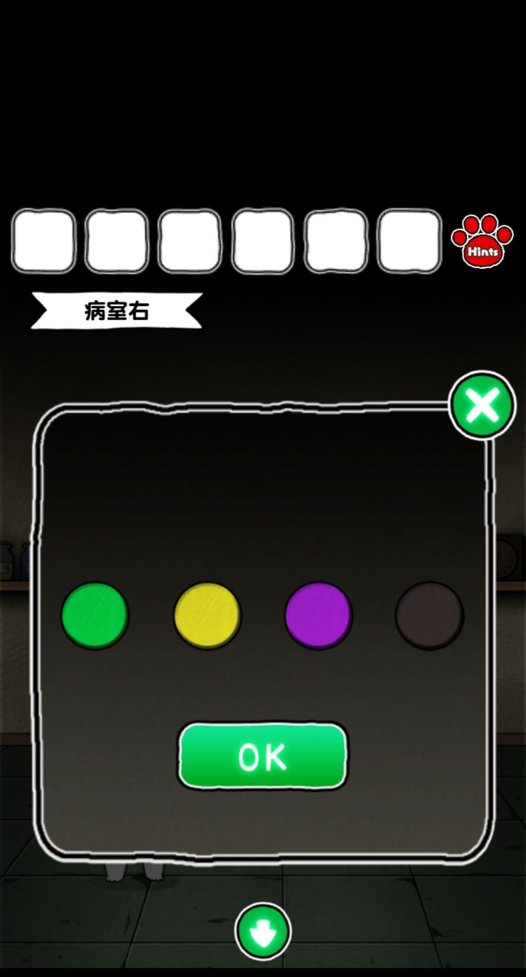 20.点击病室右中间的镜子,把镜子底下四个按钮变成步骤19中颜色对应的数字顺序,既:绿黄紫黑,打开镜子得到蓝色把手。