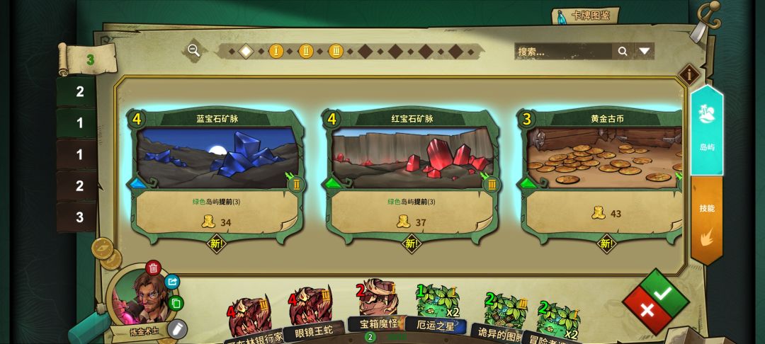 第一阶段,一般情况下是死不了的。起手最好未来收益,无中生有。这个阶段特点是牌少、血多、岛屿不凶,要考虑长远一点、节省一点,尽量可持续运营走完全程。