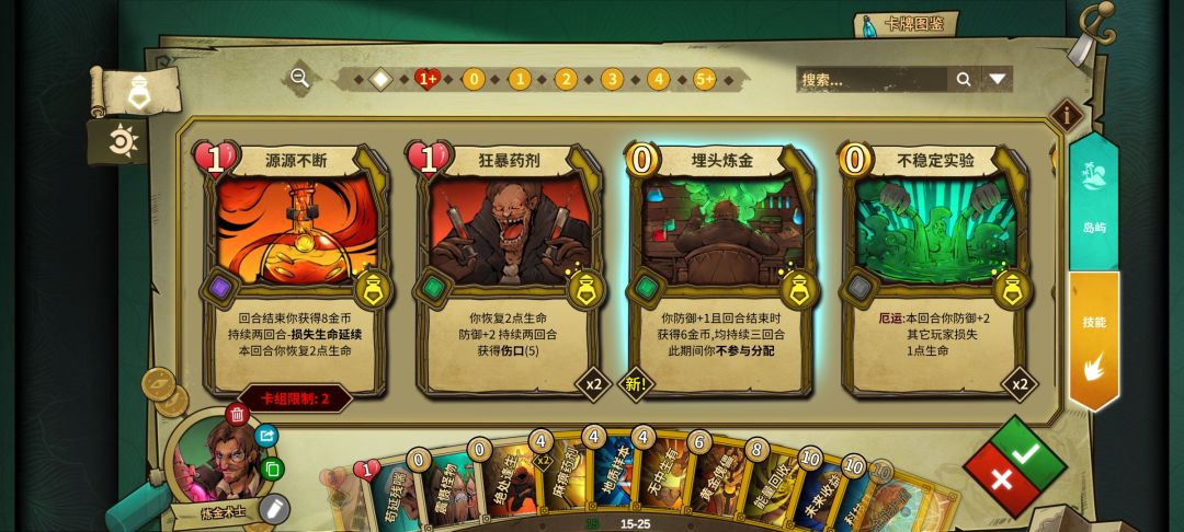 岛屿卡影响不大,随便组。但注意不要带拉绿岛的卡(被舞女吃),不要带不老泉回血(炼金第三阶段大概率跑路,回血利于对手)。
