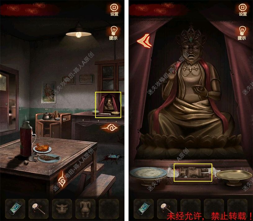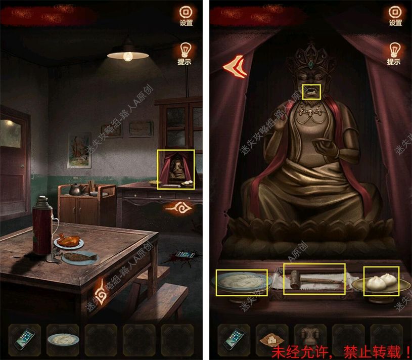 18.查看桌上的神像,将【面食】放在左侧的盘子上,拾取【钥匙】、【木锤】和【包子】。18.1