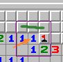 再看上面这个1,由于已经有一个雷确定了,这个数字周围的雷都找出来了,所以我们可以知道绿线这三格都不是雷。