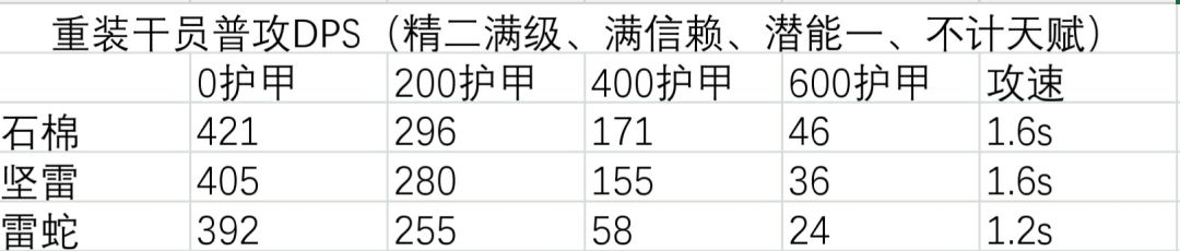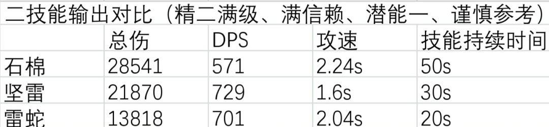由于攻击间隔变大的负面效果使得石棉二技能的DPS没有很高,但由于持续时间长所以总输出量还是要高于雷蛇和坚雷的。不过以上计算是对单个敌人情况下的数据,因为石棉二技能的范围伤害是没有攻击对象上限的,所以在怪聚集较多的情况下DPS可能会高于雷蛇她们