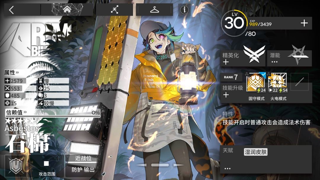 由于是五星,所以各数值都高于同类型的坚雷。相较于常规重装,法伤盾有着较高的攻击力以及法抗,但论面板的话石棉应该是目前法抗排前几的干员了,这使她在面对法术单位时不会像常规重装那样疲软,高攻再配合群体法伤还能够打出不错的输出