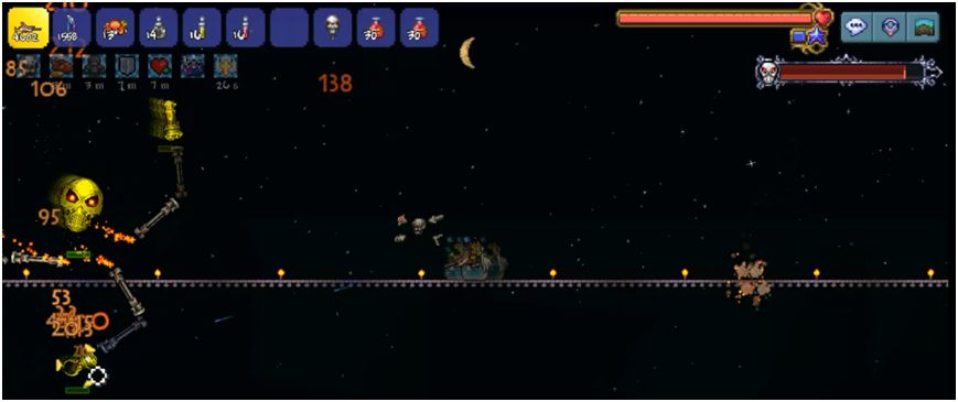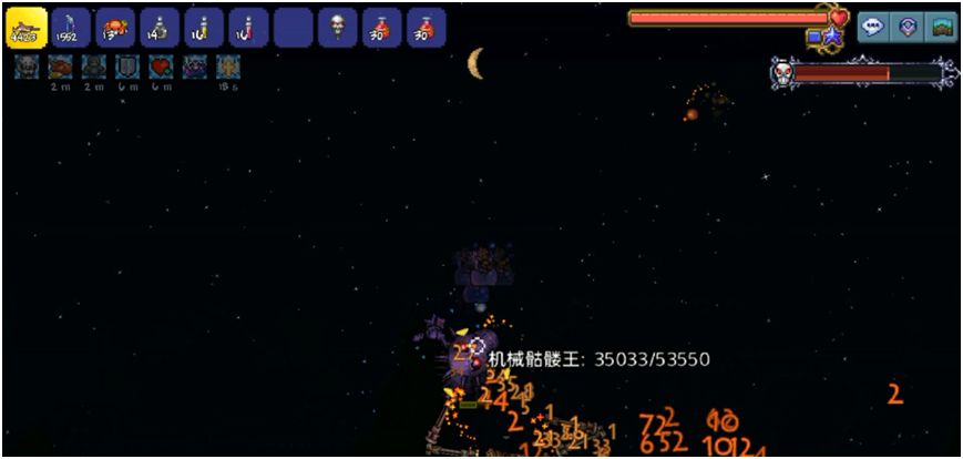 若不小心被头部追上可以跳起让坐骑弹起,不建议连续在它头上弹太多次,当到达世界顶层的时候会吃到一次伤害,使用此方法还是可以戏耍机械骷髅王的,不过需要一定的操作。