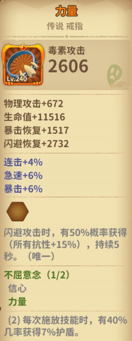 2: 力量、信心、当然在我们不缺生存的时候,可以带“开天、奥数专精”或者别的,如果一个怪物本来就韧性低,带开天或者阿迦玛之皮加暴击率,不是浪费么对不对,带个混乱之触加伤害不香嘛呱呱,伤害高被动的盾也厚~
