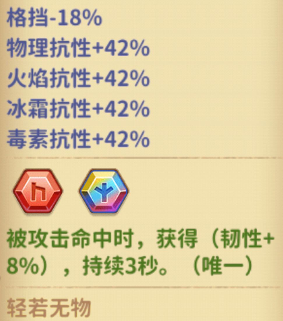 皮肤被动30+面板4+符石特效8等于42(可以插符石的哦,韧性大于等于自己进度的怪.可配带.忘了爱,韧性孔不够还是带掠夺者与白袍,免伤拉满的组合较好)