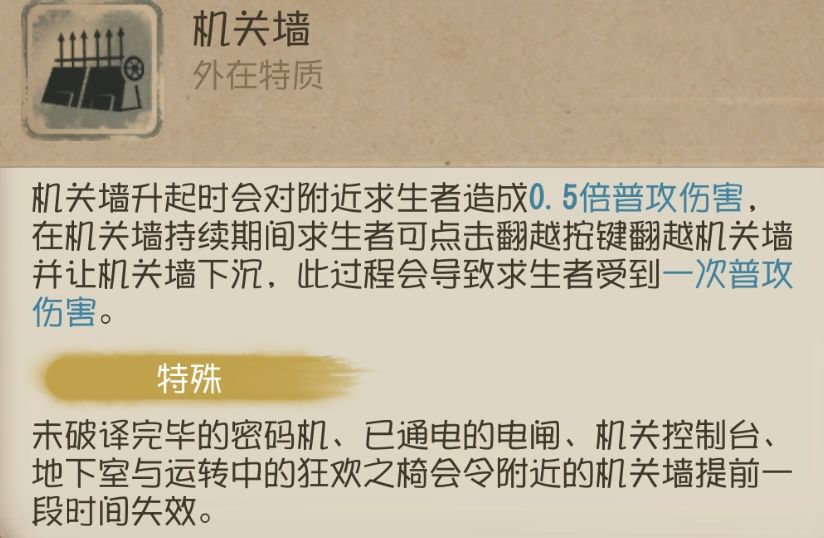 ⑦机关墙可以阻挡部分求生者的技能,例如空军的【信号枪】,牛仔的【套索技艺】都不能穿过机关墙。
