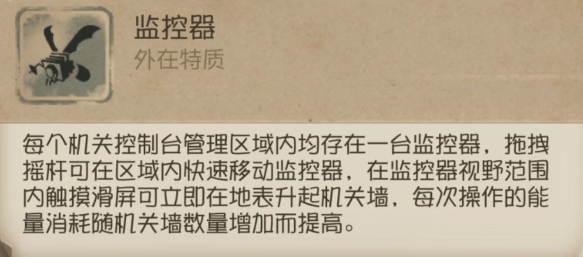 ②【机关控制台】可以被求生者破译,同时被破译完成的【机关控制台】在监控面板会呈灰色状态,此时疯眼将无法使用该范围的控制台,且一段时间内该控制台无法恢复能量,当该区域能量归零时疯眼将失去本区域的联系。疯眼的所有技能都是围绕控制台进行的,因此疯眼需要尽量保护自己的【机关控制台】不被求生者破译;
