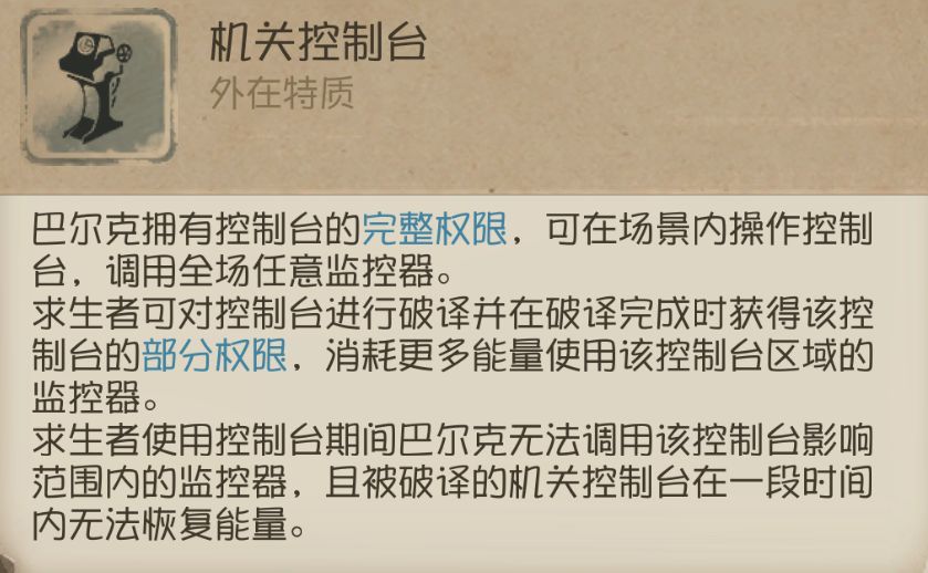 ④求生者在操作【机关控制台】时不能移动,且部分区域的【机关控制台】可以相互管控,可以利用这一点,在求生者操作控制台时对其进行攻击。