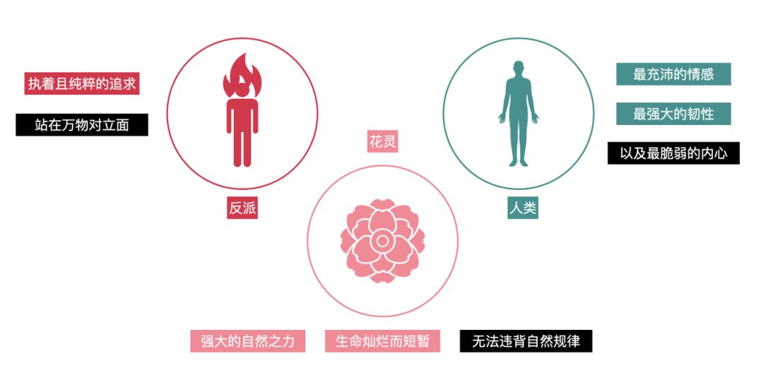 在《圣境之塔》的几方势力中,人类总认为自己能掌握宿命,我们探索、追求,企图在有限的生命中,抓住无限的价值,甚至不惜在过程中迷失自我,殊不知人生不过来去双程; 反派可以说是放大了某些欲望的人类,当欲望成了执念,反倒显得更加纯粹,他们目的明确,不择一切手段,被执念支配,不反思、不节制,任何挡在执念前的都是敌人; 花(代表非人类)按道理是最没有理由反抗宿命的,它们没有思想、没有欲望,但是当它们与宿主(人类)联结,赋予了人格之后,一切开始悄然变化了。