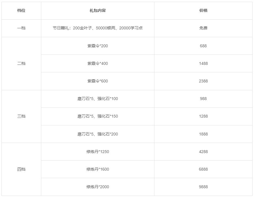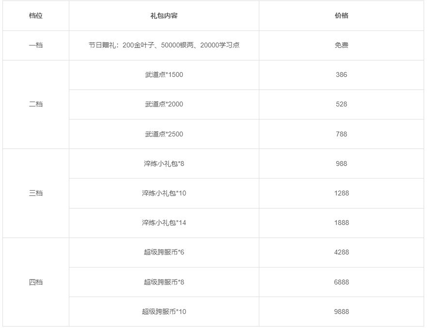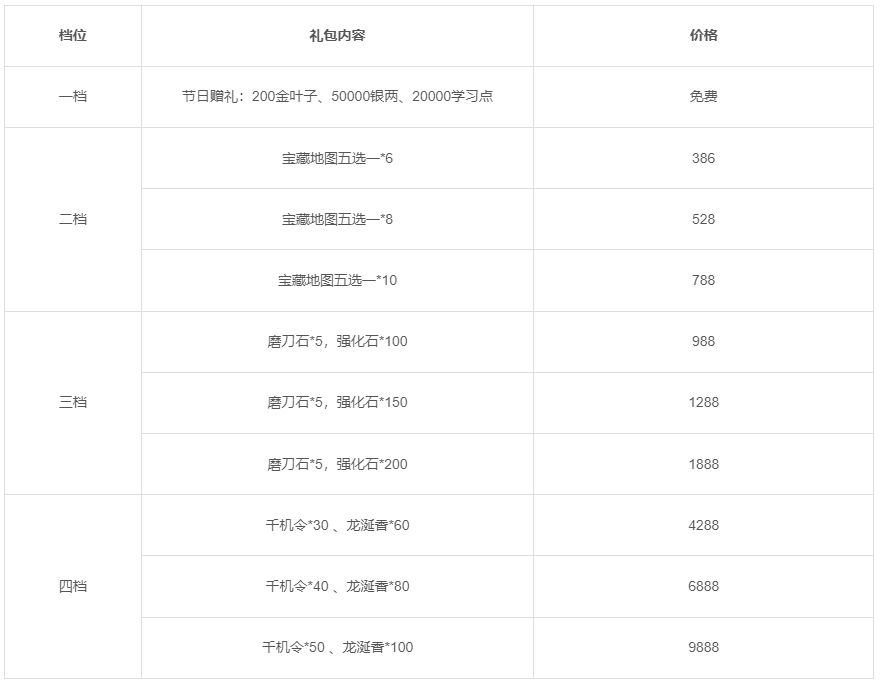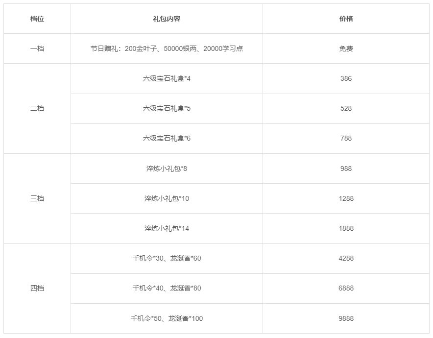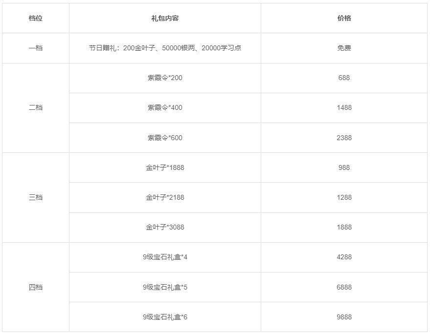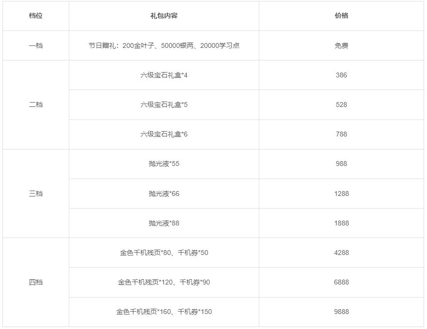 活动一:活动期间将限时上架节日礼包,礼包内容如下: