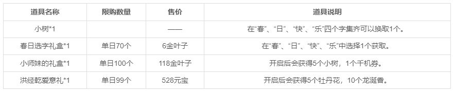 活动期间,通过“江湖磨砺”挂机,在挂机次数内必定掉落“春”、“日”、“快”、“乐”集字道具中其中1个,集齐四个字可兑换道具“小树”,收集“小树”可以兑换各式好礼。