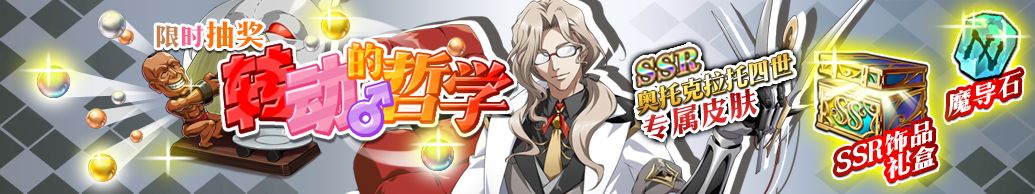 活动期间,消费一定的圣魔晶,赢取福利大奖。往期哲学皮肤限时复刻,大奖为包含SSR英雄奥托克拉托四世限定皮肤「假面修容师」在内的6选1皮肤礼包!