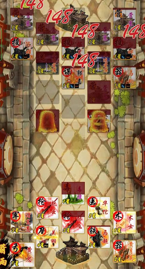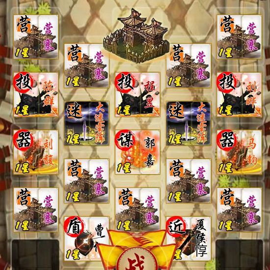 思路:在老巢周围布满棋子,并要有恢复性武将要维持棋子的血量。器械的黄月英肯定不能少。此外,在多回合跟对面打消耗的情况下,上诸葛亮绝对有奇效。