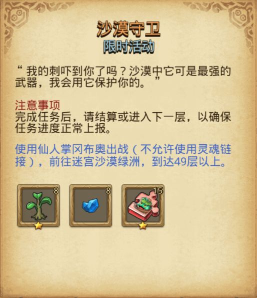 签到、铲除魔物、持续发展、沙漠守卫及守护执照