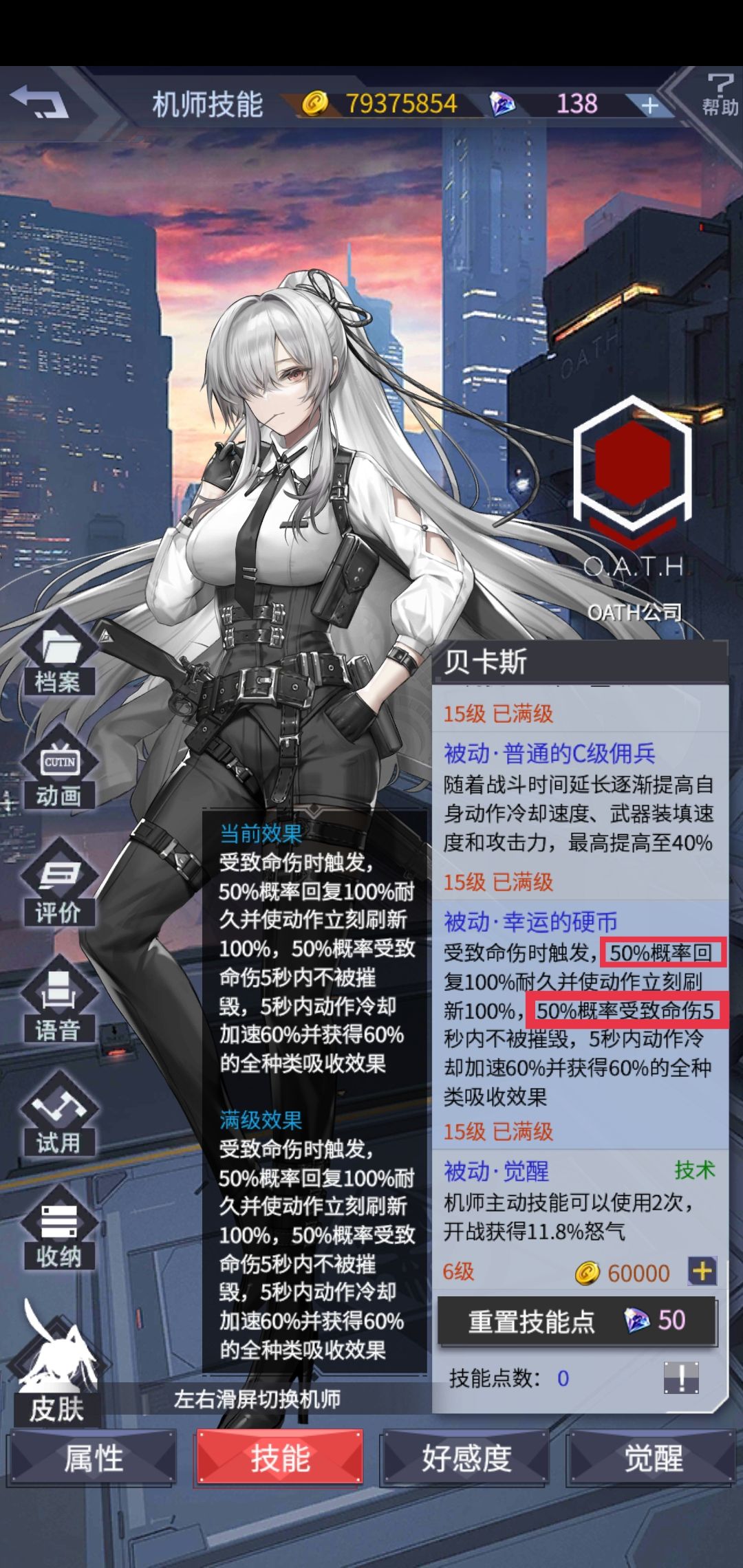 第1个受致命伤时触发, 50%概率回复100%耐 久并使动作立刻刷新 100%