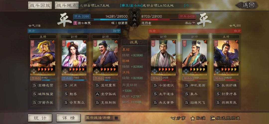 一方面,我们有很多指挥、被动战法,而且都构成本队的核心思路。另一方面,我们的输出其实是不够的,如果当锋摧决打到了SP袁绍、沮授,稳定输出被伪报的话,本队的输出会少很多,增加更多不确定因素。