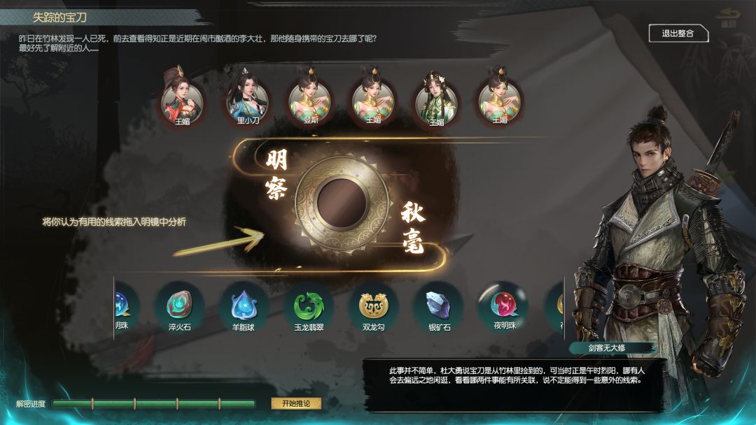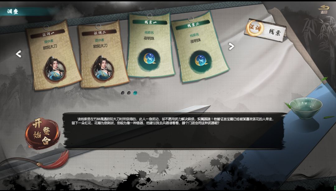 在整合界面,拖动任意两条线索进入镜内,若两条线索相关联,则可触发一个弹窗让玩家选择一系列推理问题,当大侠们完成问题之后,就可以点亮一个进度条标志。怎么样?是不是很简单~