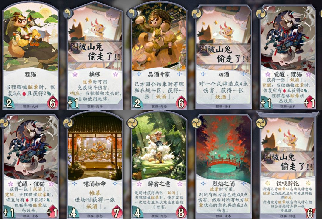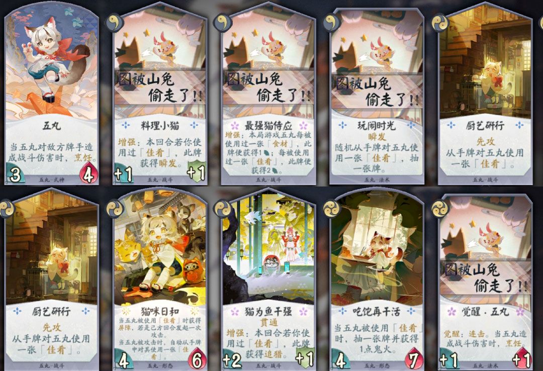 猫咪日和,2勾,削了回合外响应,增加进场时烹饪。己方回合当五丸被使用佳肴时,获得屏障且发起一次攻击。tips:食神效果给其他式神使用,会触发。