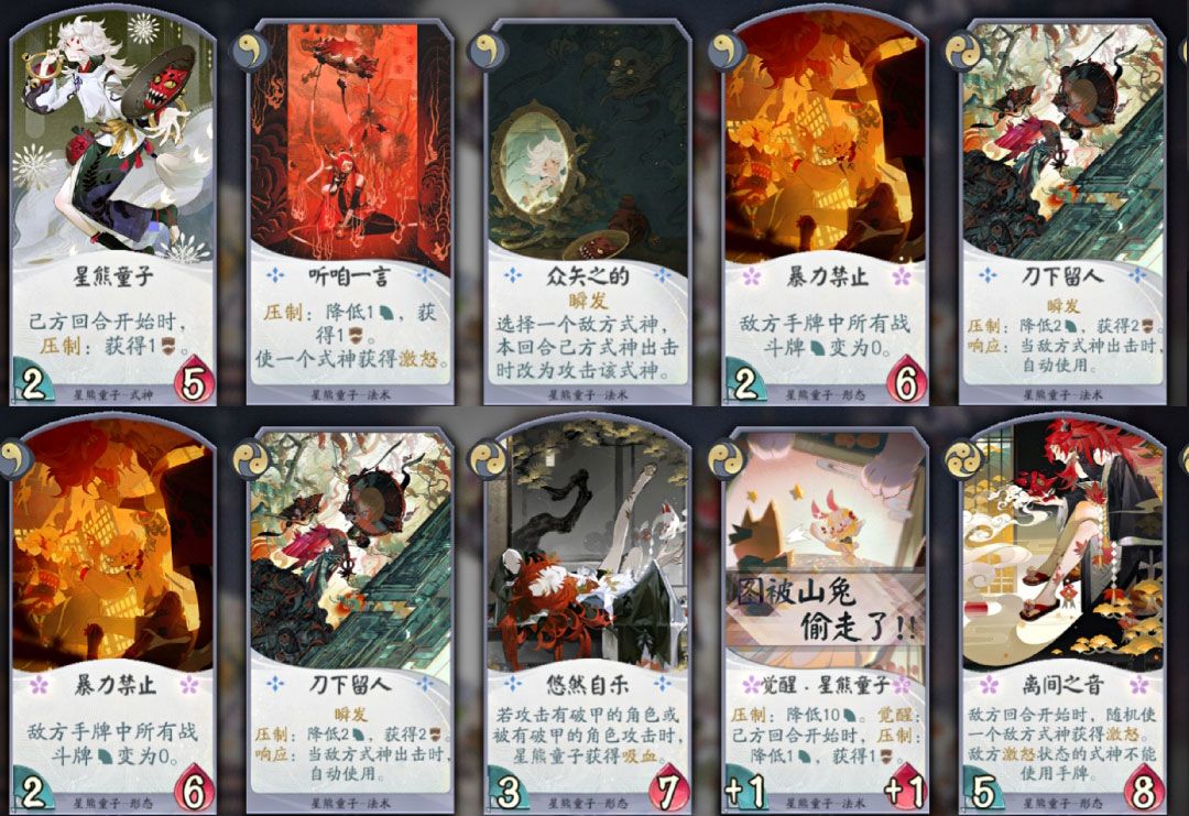 悠然自乐,2勾,6/6,敌方式神使用战斗牌时,星熊童子获得2/2。tips:上形态才有获得,并非在手牌中增益。