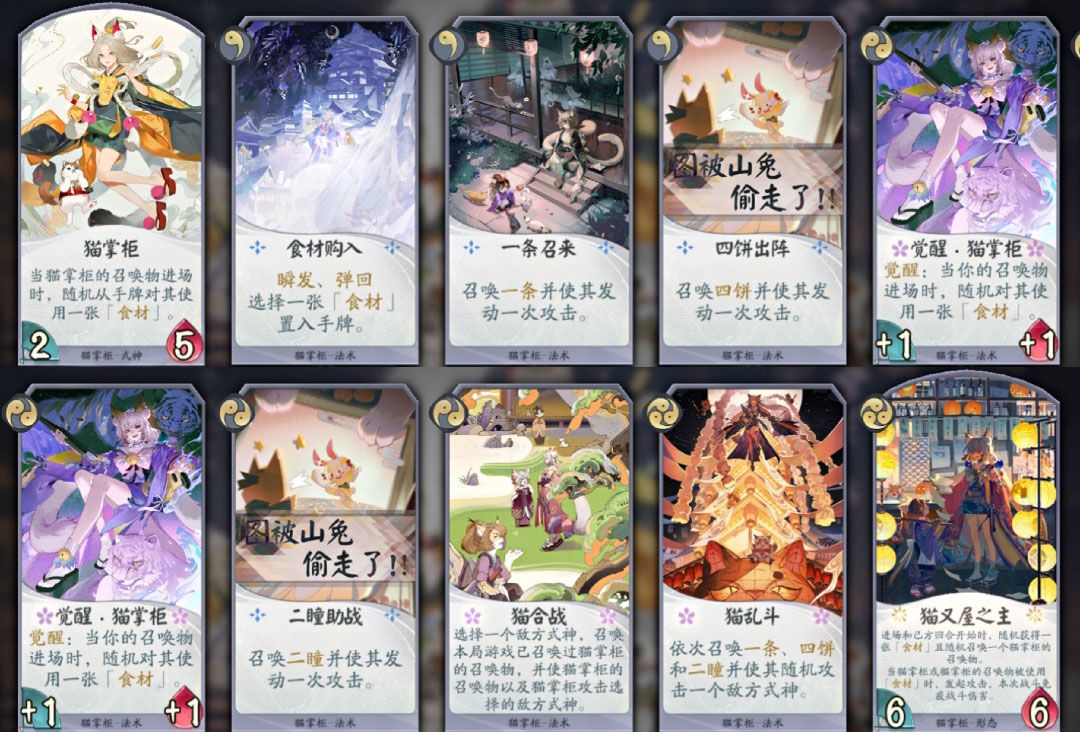 猫又屋之主,3勾,进场和己方回合开始时,随机将一张食材置入你的手牌且随机召唤一个猫掌柜的召唤物。猫掌柜的召唤物被使用食材时的效果触发两次。