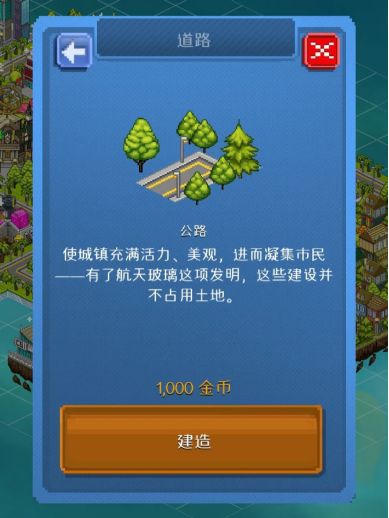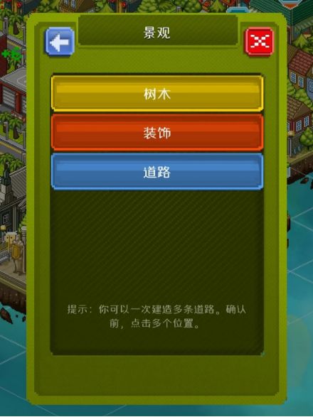 除了建筑和别墅之外,我们还可以为城市建造景观,景观有树木、装饰、道路可以选择。