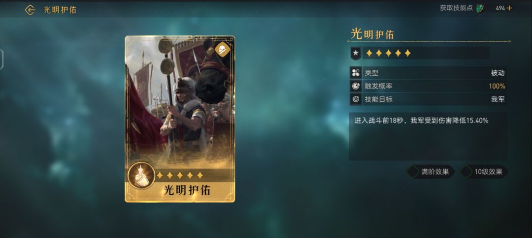技能目标 我军进入战斗前18秒,我军受到伤害降低15.40%