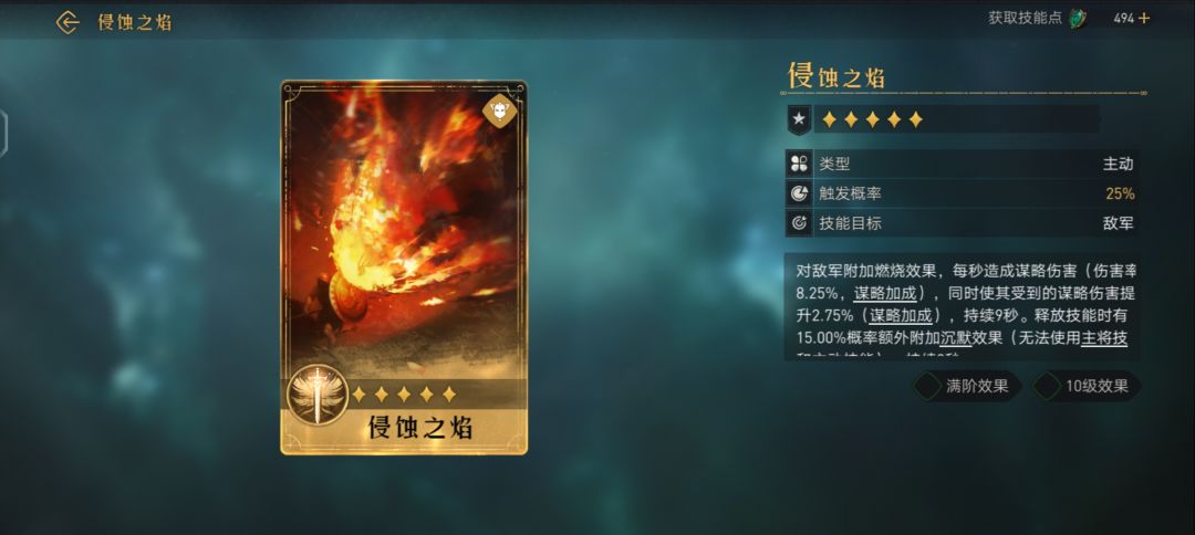 技能目标对敌军造成谋略伤害(伤害率85.25%,谋略),并施加燃烧效果,每秒造成谋略伤害(8.25%,谋略加成),持续6秒
