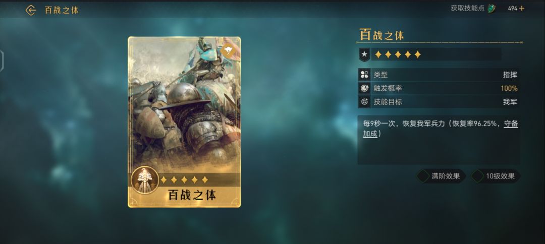 对敌军造成武力伤害(伤害率110.00%,武力加成),恢复我军兵力(恢复率49.50%,武力加成)
