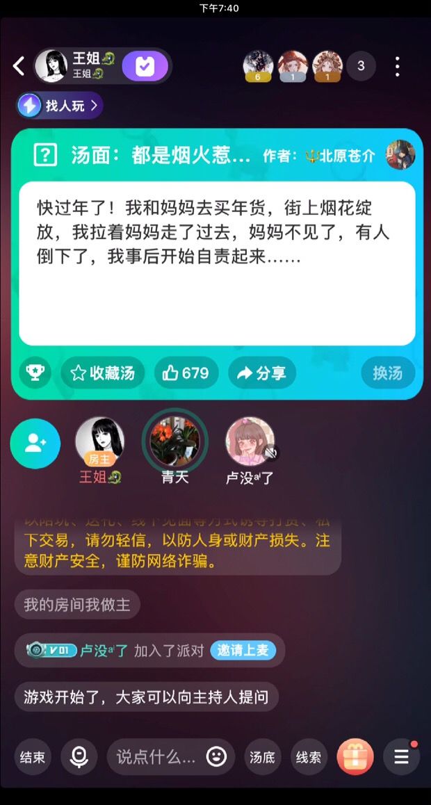 给大家推荐一个海龟汤具体而言还是很简单很好玩很适合新手的是和朋友玩的时候意外发现的海龟汤的点赞数量还是比较高的汤面是快过年了!我和妈妈去买年货,街上烟花绽放,我拉着妈妈走了过去,妈妈不见了,有人倒下了,我事后开始自责起来……具体汤底不易透露名字叫都是烟花惹得货是一名叫北原苍介的大大的汤,是一款叫谁是凶手的软件上的汤~里面还有超多小游戏有兴趣的话可以下载玩一玩
