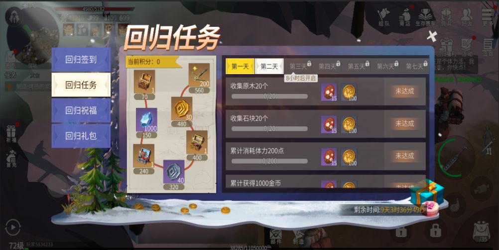 回归任务分为7天,每天会开启新的一批任务,完成任务可以获得积分,累计积分可以领取积分达标奖励。