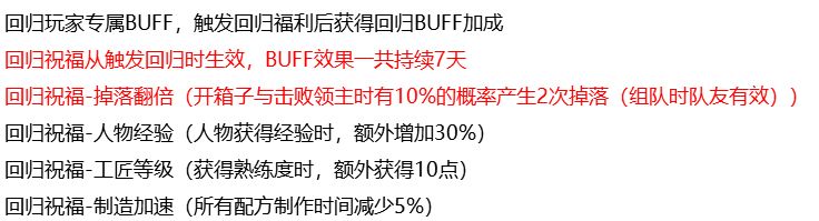 回归玩家专属BUFF,触发回归福利后获得回归BUFF加成,而且和回归玩家组队,可以享受一些回归玩家的BUFF加成,带你朋友一起上分吧!
