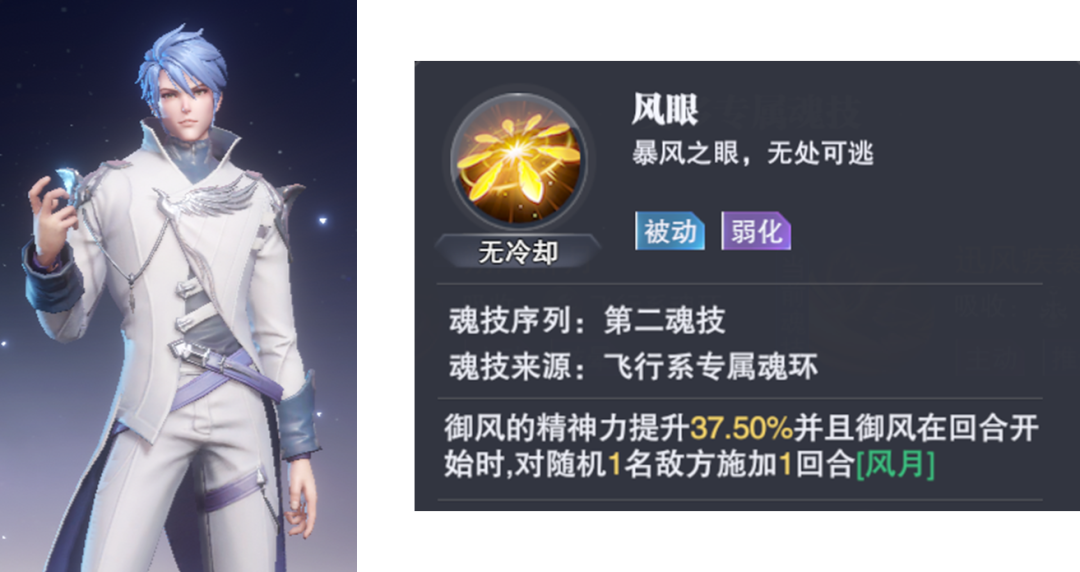 第六是御风的2-1技能【风眼】,此技能所赋予的最高60%的被动单人增伤也曾是御风能够驰骋于各大战场的最大原因,不过目前随着10万年胡列娜的逐步普及,御风的上场率已经是慢慢的回落,但是【风眼】技能也是在增伤魂师历史上不可磨灭的一个印记。