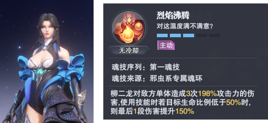 第二则是号称机关枪biubiubiu的女王柳二龙,她的1-2技能【烈焰沸腾】是一个非常强力的多段输出技能,且对50%血量的敌人会有大幅的伤害提升,另外此技能最大的特点就是针对50%血量以下的敌人会自动无消耗释放一次,这个能力也基本上就是目前柳二龙在各类战斗中的最大作用。