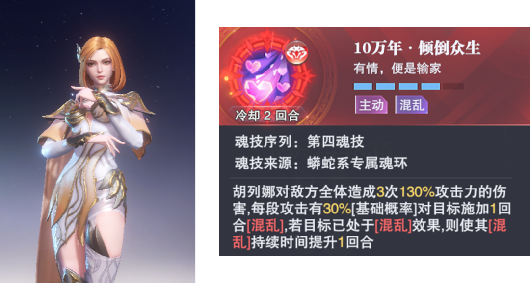 第五是胡列娜的4-1技能【倾倒众生】,想必大家练一个胡列娜最大的原因也是在于这次技能在10万年魂环下的永久3层30%增伤,最高90%存续全场的增伤效果也是目前游戏中的一绝,同时配合2-1的混乱状态被动增伤也可以是狐狸在短图中的增伤能力得到很好的发挥。