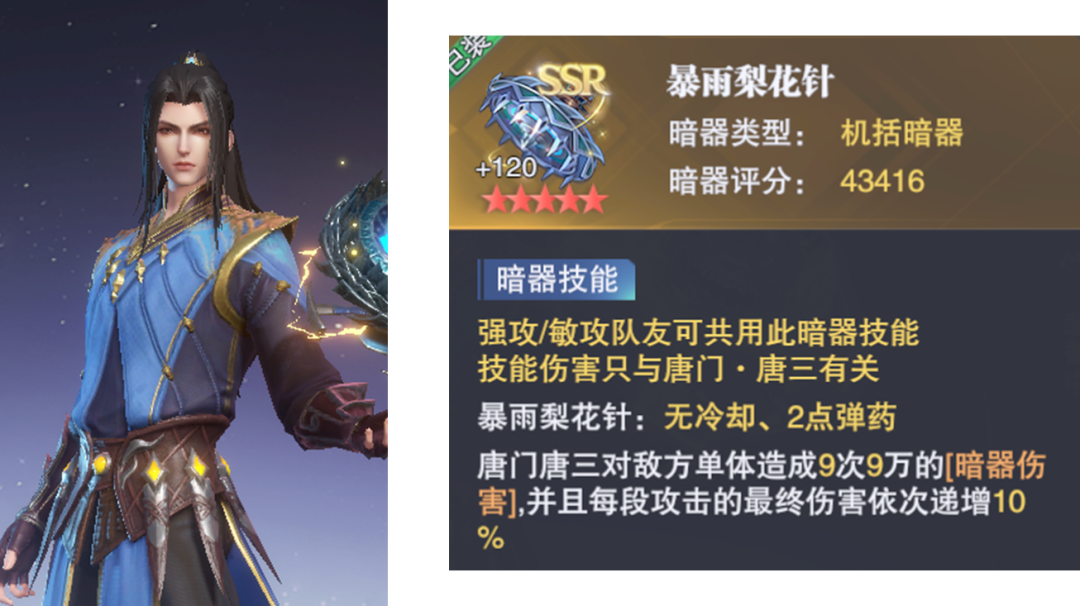 第四则是暗三的暗器【暴雨梨花针】,目前暗三虽然已经有了好多好多不同种类的暗器,但是论使用率和培养泛用度而言,无疑【暴雨梨花针】依然是目前绝大部分玩家手中暗三的首要武器,同时也是支撑起唐晨暗器队的核心之一,特别是在唐晨暗器队中【暴雨梨花针】的练度需求也低了不少,因此这也是让其能够脱颖而出的一大原因之一。