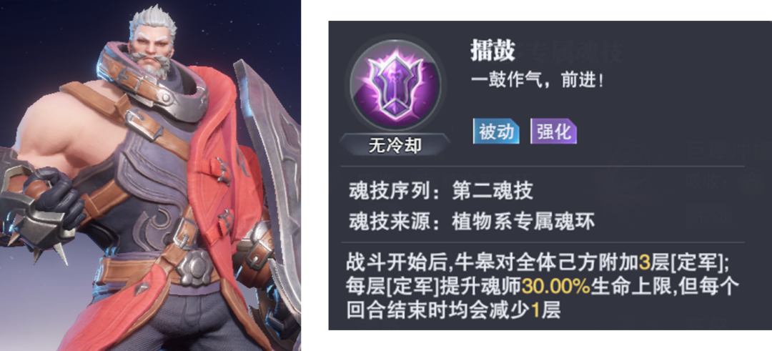 今天的最后一位则是老犀牛牛皋的2-1技能【擂鼓】,此技能所能在战斗开始时赋予全队队友的【定军】效果可以极大的提升我方在战斗前期的生存能力,同时在PVP玩法中的防守一方,基本上老犀牛现在也是必带的角色之一,配合到独孤博的开局减伤,佘龙的开局行动限制和水冰儿的击退行动条,这种肉队打起来的感觉真是有点过分了!
