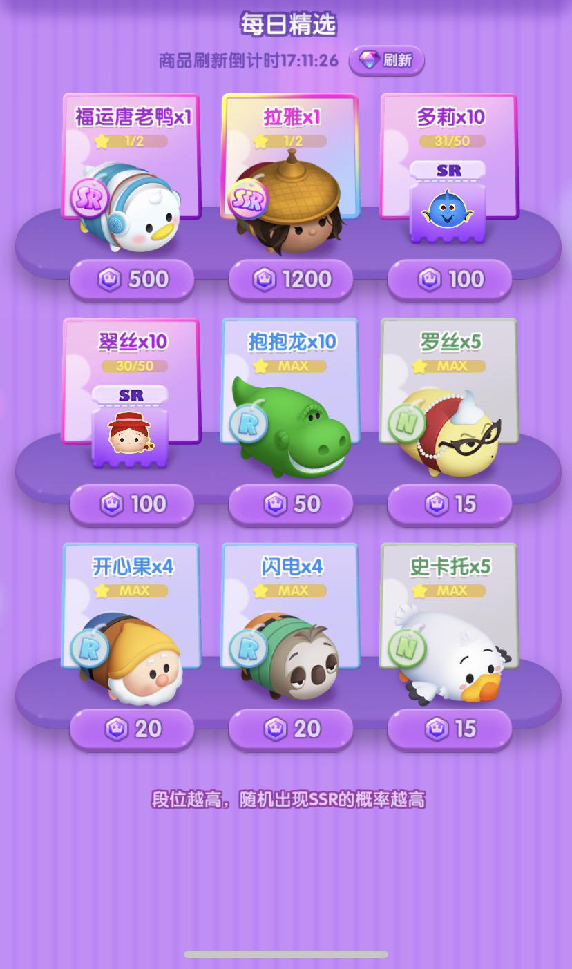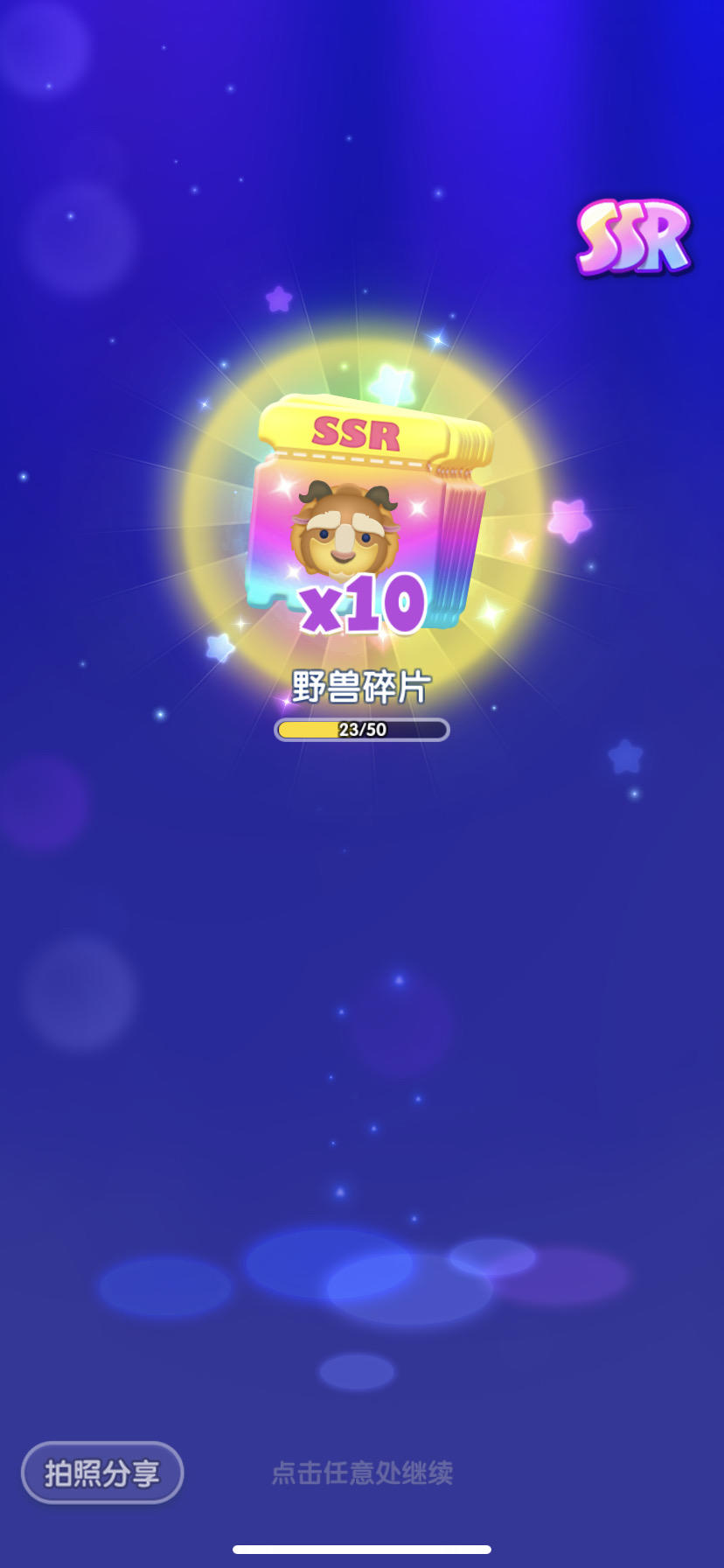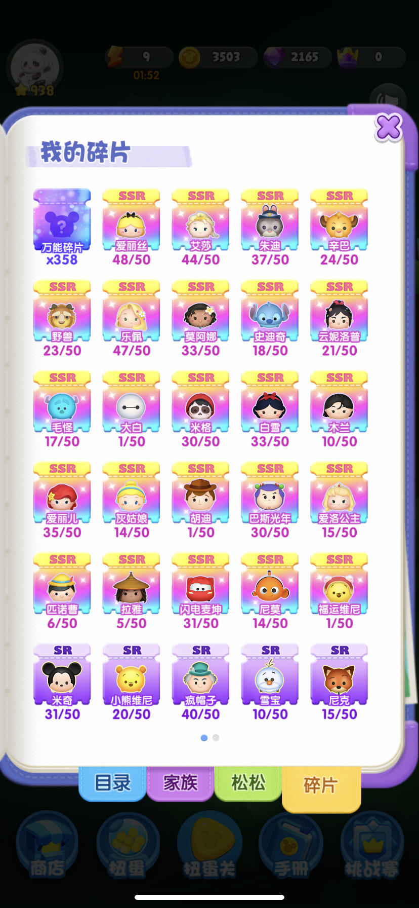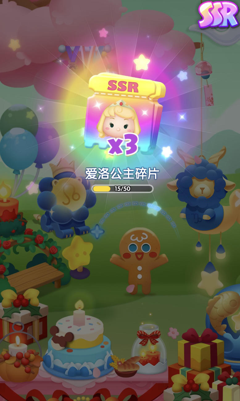 俩日份的SSR碎片:爱丽丝x1、艾莎x2、朱迪x1、云妮x1、史迪奇x1、大白x1、毛怪x1、爱丽儿x1、爱洛x3、拉雅x1