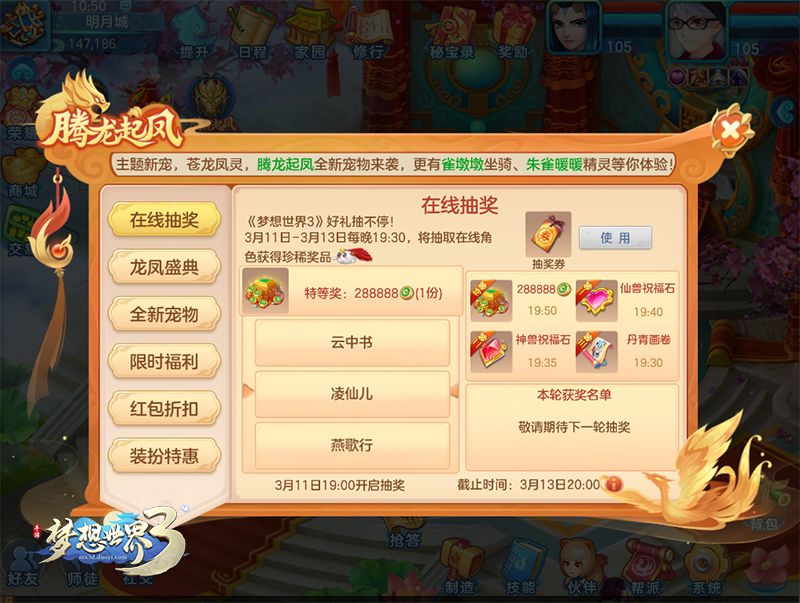 丨在线抽奖:3月10日9:00~3月13日19:00期间,活跃度达到70点,可获得抽奖券,使用抽奖券可以获得奖励,更可参与在线抽奖活动!同时,梦想大陆将会在3月11日、3月12日、3月13日每晚19:30-19:50进行抽奖,有概率获取丹青画卷、神兽祝福石、仙兽祝福石、288888梦想币奖励!