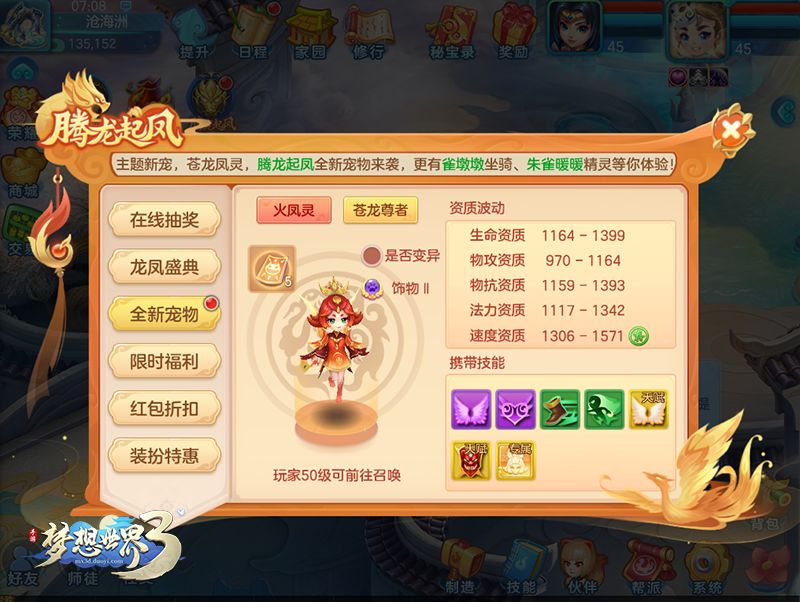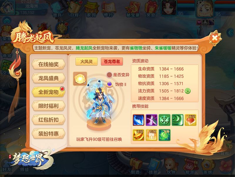 本周游戏更新后,《梦想世界3》手游全新内容“腾龙起凤”正式上线,全新宠物、全新兽诀、全新伙伴来袭,邀你一同体验更多的玩法,体验梦想世界更多的可能性!全新坐骑、小精灵以及主题聊天装饰也将与少侠们见面,还有丰富的福利活动等你来参与,一起来看看本周的更新内容吧!