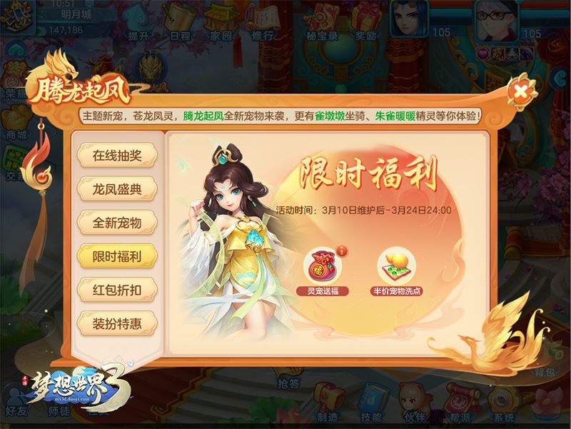 丨龙凤盛典:3月10日维护后~3月31日24:00,完成日常获取积分可领取奖励,详细可前往腾龙起凤界面参与。